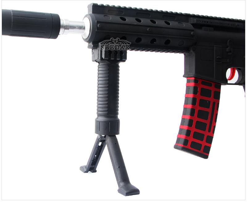 按下按钮解锁Bipod Legs,并收回弹簧加载的腿,推回。