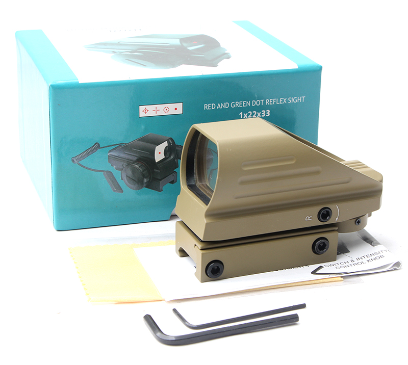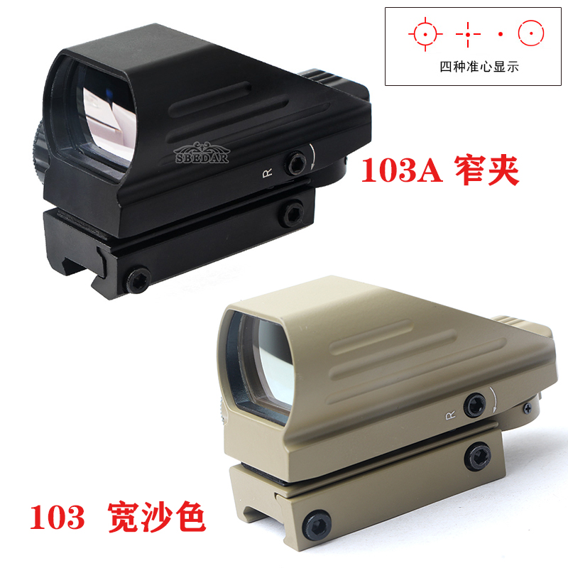 103瞄准镜四变点内红【产品名称】:全息瞄准器【产品特点】:内红绿点隐形 【产品型号】:103A【产品倍数】:1倍【产品口径】:22mm【产品夹具】:20mm【是否带灯】:红绿光